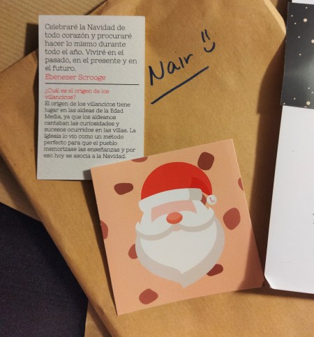 También incluye una tarjeta con una frase navideña y curiosidades sobre los villancicos. Por el otro lado de la tarjeta hay un QR con una lista de reproducción. Cada mes varía y este mes son canciones navideñas. ¡Ojo! Porque hay una canción intrusa que no pertenece a este género.