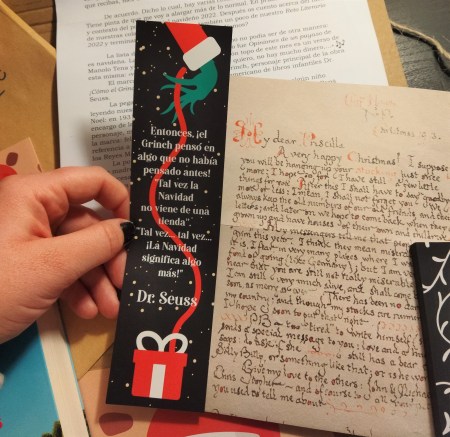 Además, el marcapáginas, por el otro lado, incluye un trocito del Grinch de Dr Seuss, un personaje navideño que siempre he adorado.